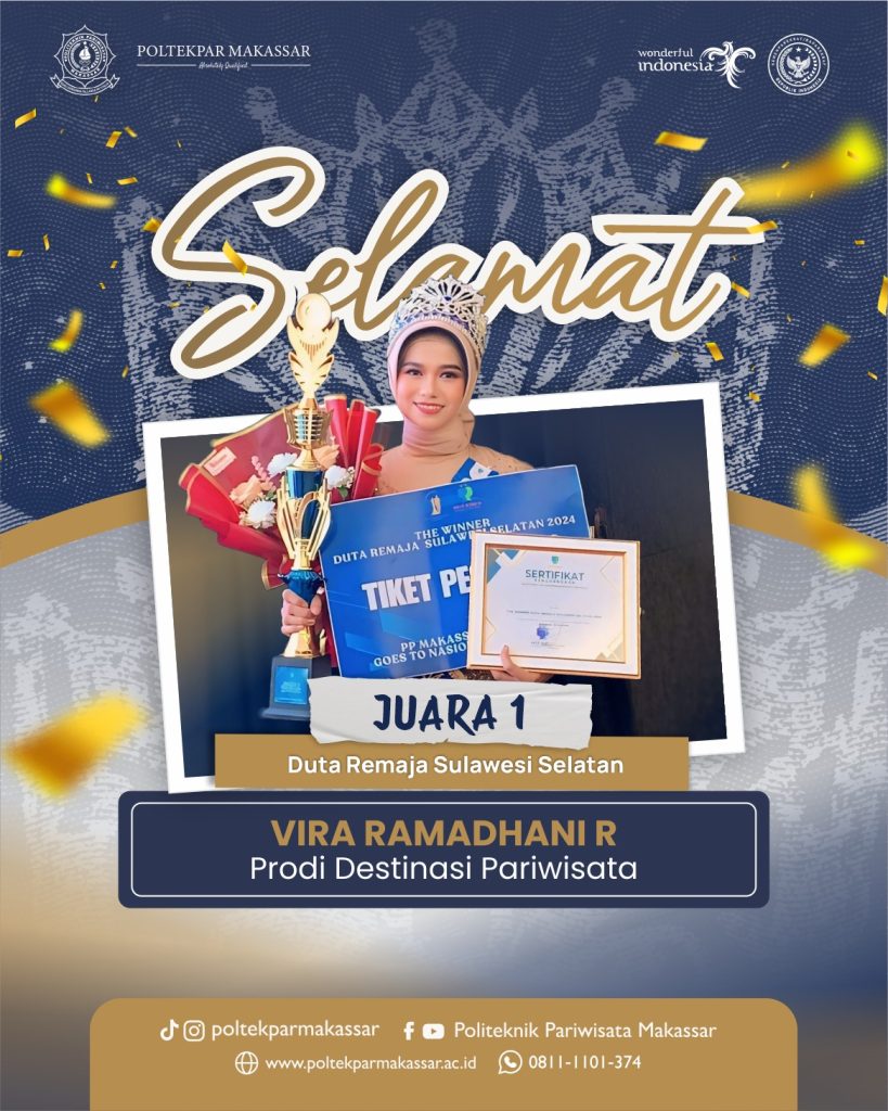 Yuk kita ucapkan selamat kepada Vira Ramadhani R mahasiswa Prodi Destinasi Pariwisata yang berhasil meraih prestasi sebagai Juara I pada ajang Pemilihan Duta Remaja Sulawesi Selatan 2024🥳🥳
